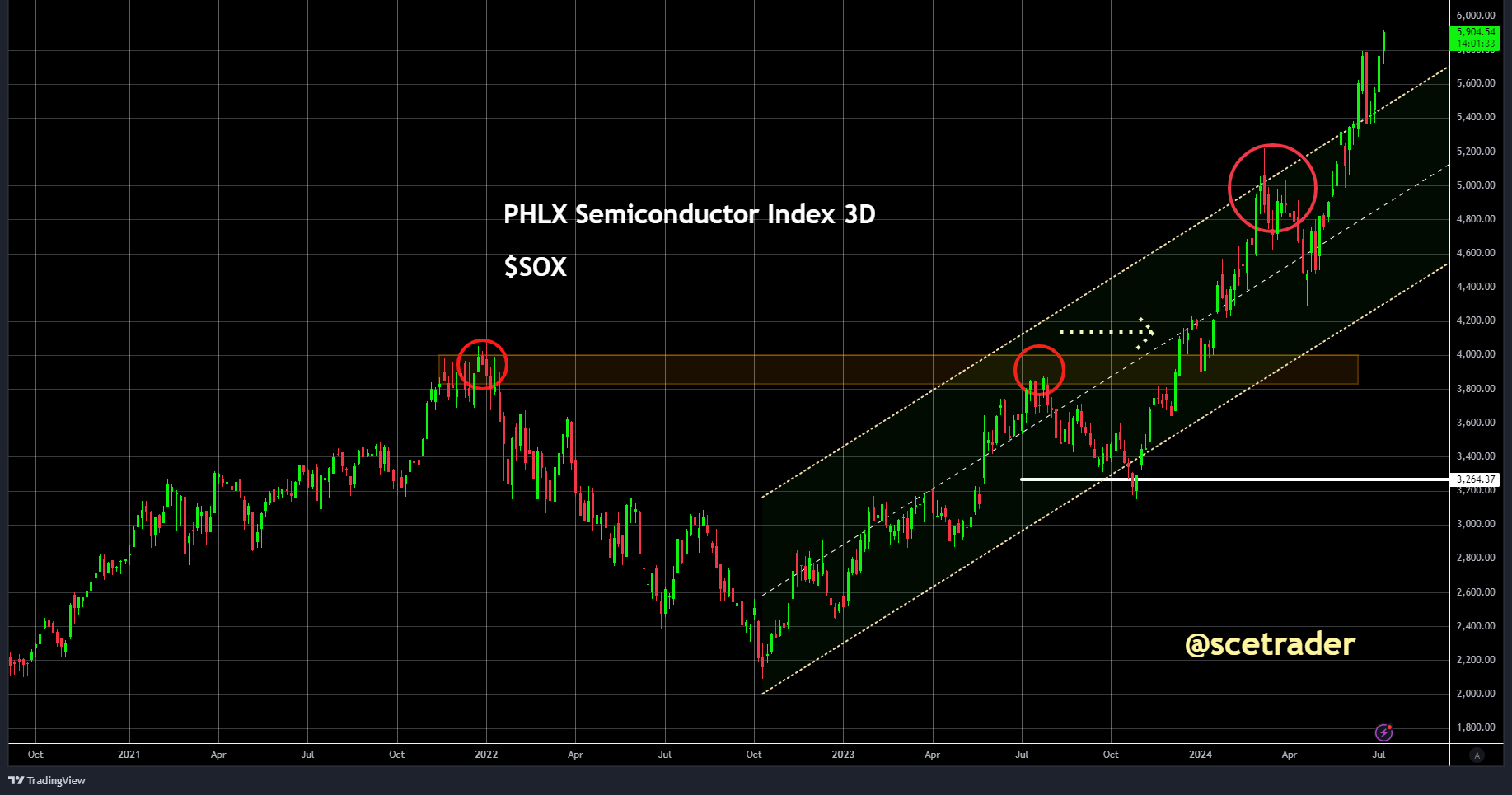 De PHLX Semiconductor $SOX, bestaande uit chipaandelen, laat op de grafiek een stevige opwaartse trend zien. Dit wordt bevestigd door de stijgende kanaallijnen waarin de koers zich beweegt.