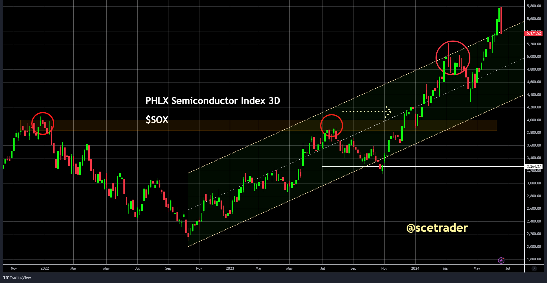 De grafiek van de Semiconductor Index $SOX toont een duidelijke lange opwaartse trend die zich uitstrekt over een significante periode. Vanaf het dieptepunt medio 2022 heeft de index een gestage stijging laten zien binnen een opwaarts kanaal. Deze opwaartse beweging wordt ondersteund door meerdere hogere toppen en bodems, wat duidt op een gezonde trend.