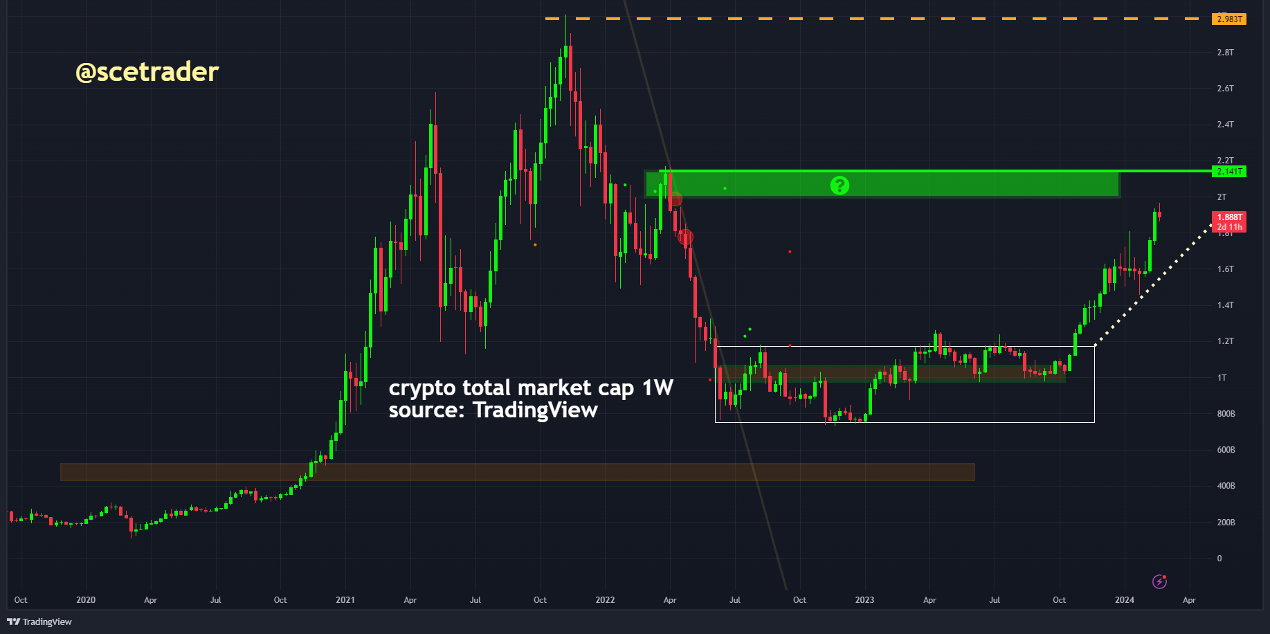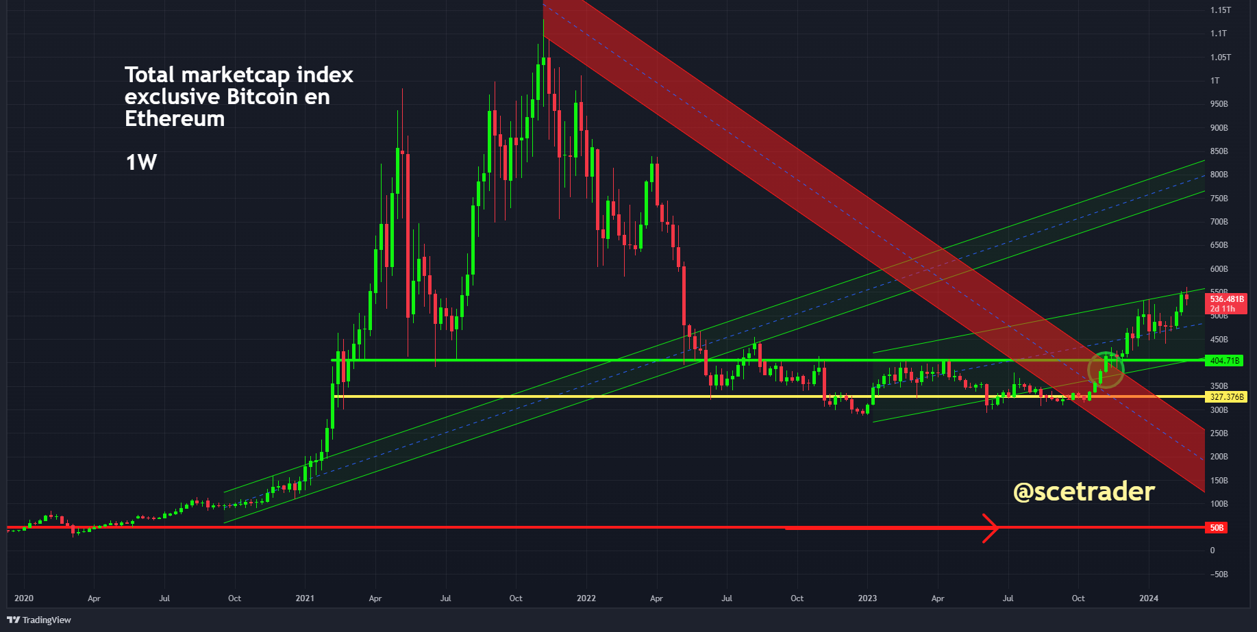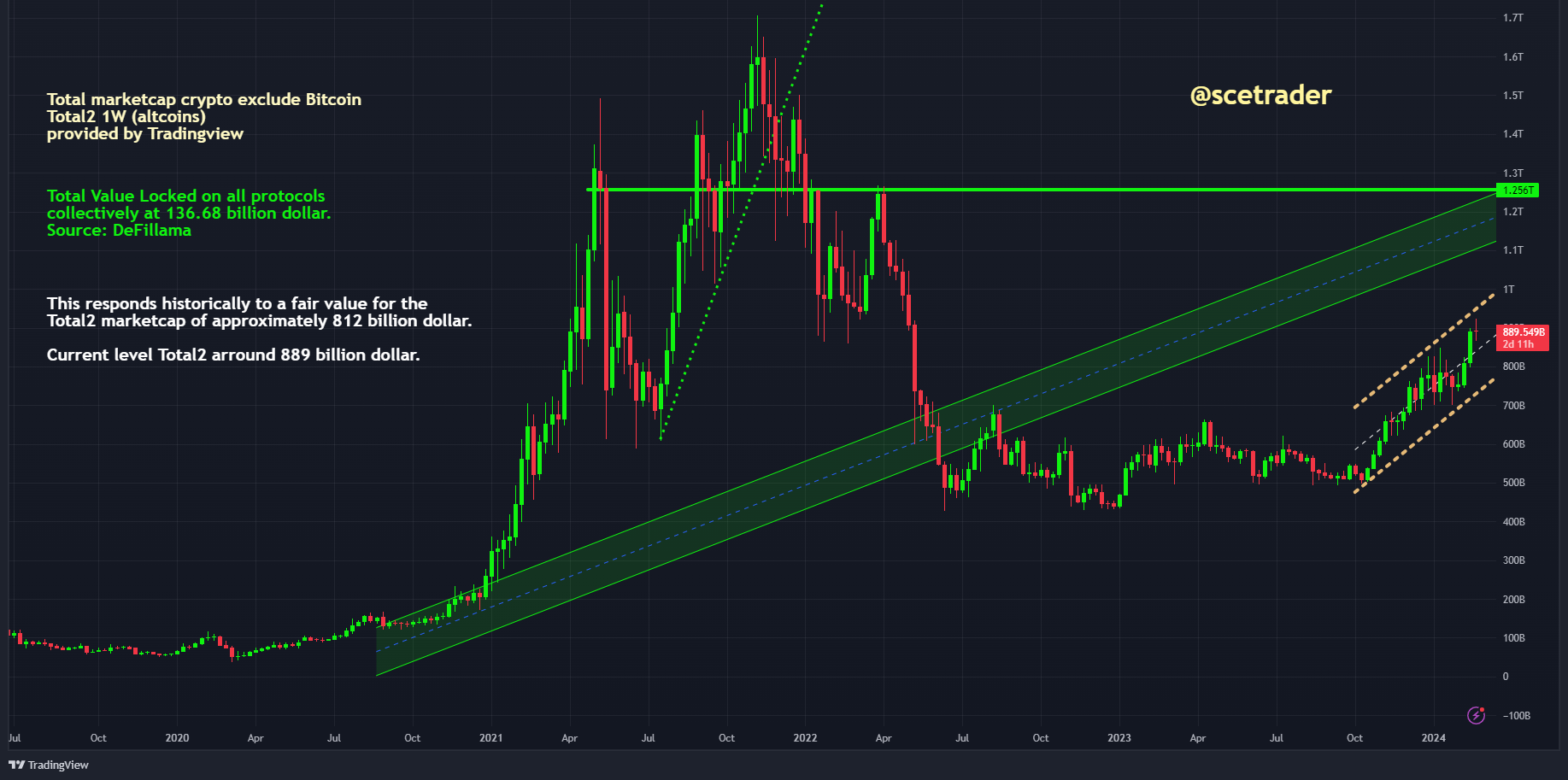 De Total Market Cap Crypto Index (TOTAL1), die alle munten bij elkaar vertegenwoordigt exclusief stablecoins, zit in een uptrend. We hebben gezien dat begin 2024 er tijdelijk een zijwaarts patroon was en sindsdien hebben we een aantal weken gehad met een sterke uptrend.