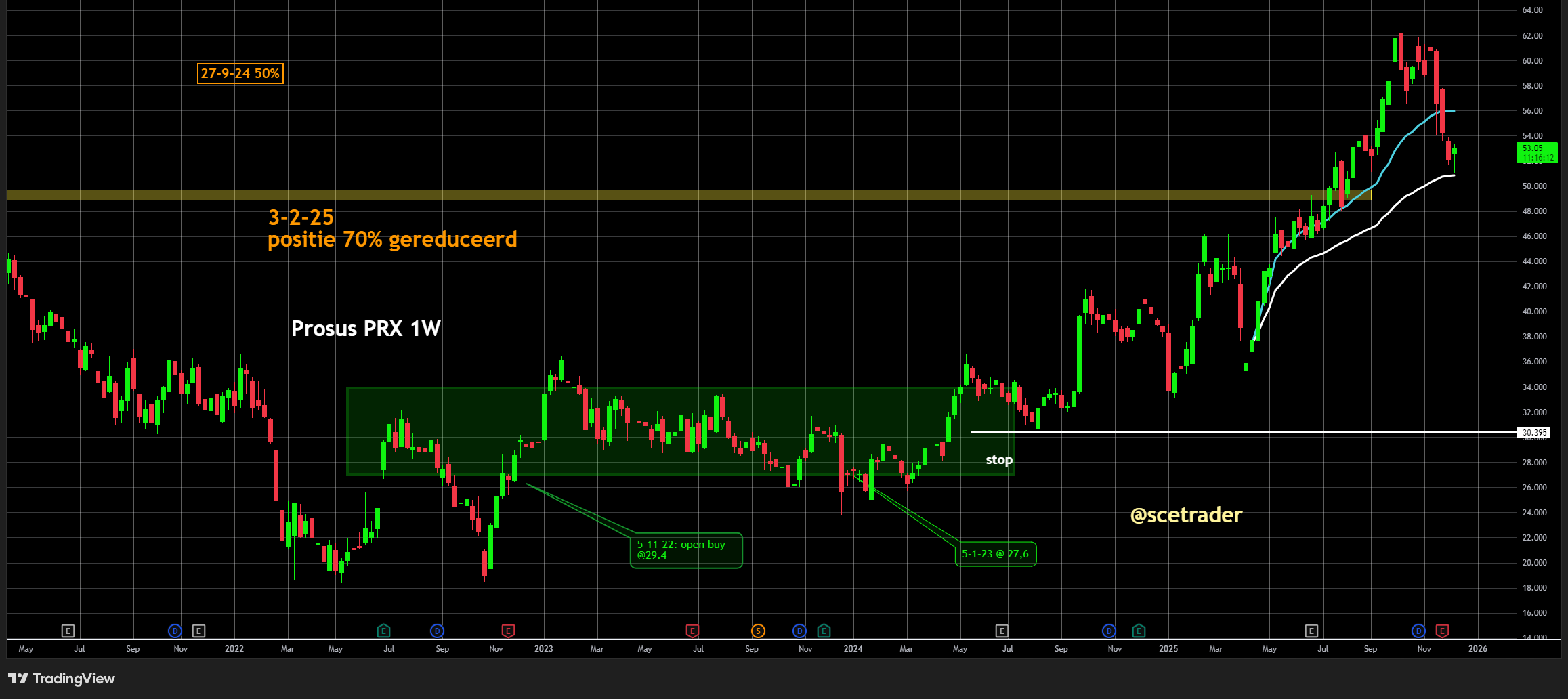 Onze visie op het aandeel blijft dat Prosus een aantrekkelijke diversificatiestructuur biedt, waarbij de onderliggende waarde van de deelnemingen steeds zichtbaarder wordt. Wij blijven zitten op een stijging, maar kopen op dit moment niet bij omdat wij tevreden zijn met onze huidige exposure.