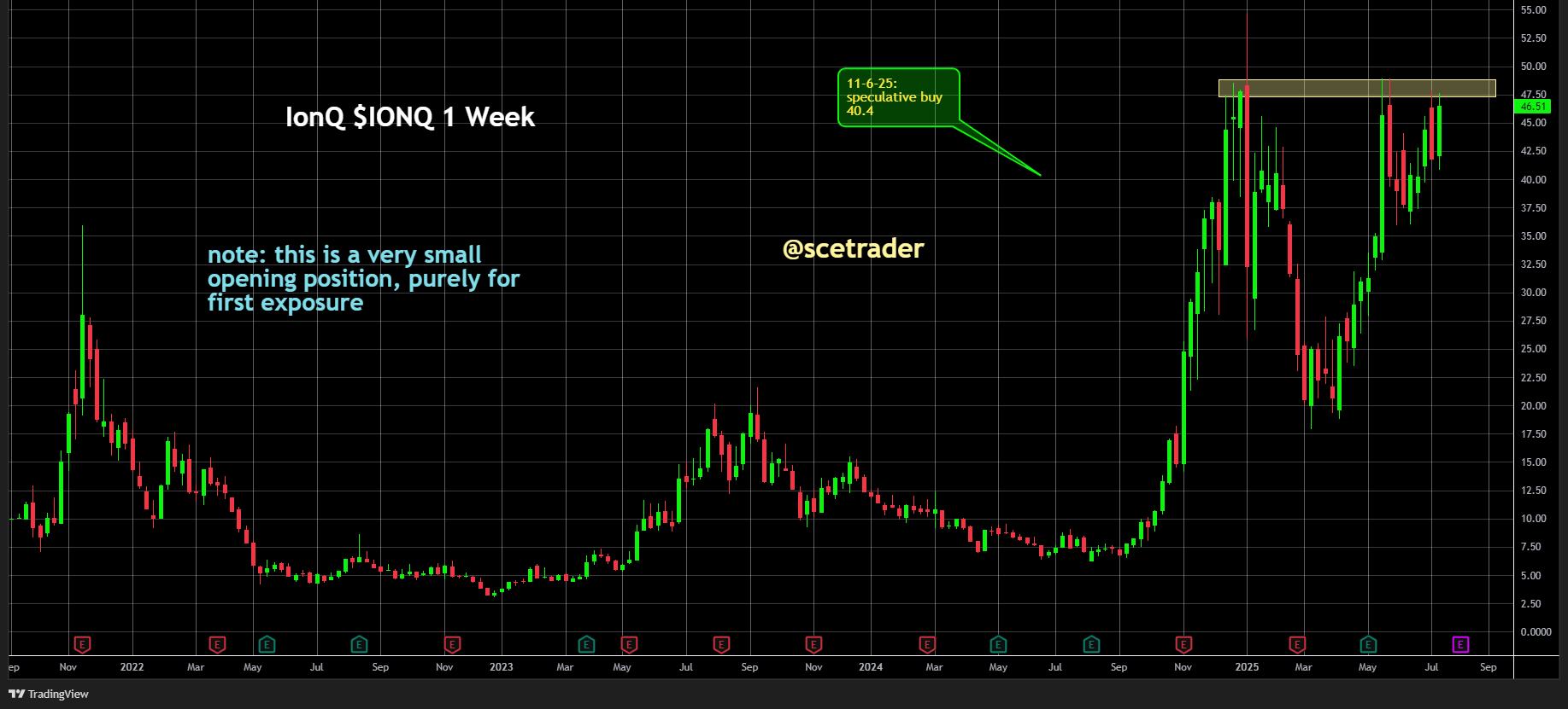 IONQ staat technisch op een kantelpunt en test voor de derde keer een hardnekkige weerstand. Het bedrijf is één van de serieuzere spelers in de quantumcomputingmarkt en beschikt over sterke samenwerkingen en technologie. Wij blijven op een stijging zitten en zien een mogelijke uitbraak als startpunt voor een nieuwe opwaartse fase. Een eventuele correctie zou volgens ons tijdelijk zijn.