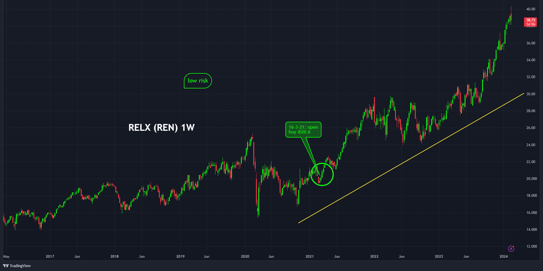 De cijfers bevestigen dat onze visie onveranderd blijft. We zien het als een lange-termijn-groeier, waarbij we af en toe wellicht vergoten en verzwaren en heel soms even uitstappen om vervolgens weer snel in te stappen. In maart 2021 zijn we bijvoorbeeld opnieuw ingestapt in RELX toen de koers op 20,60 euro lag.