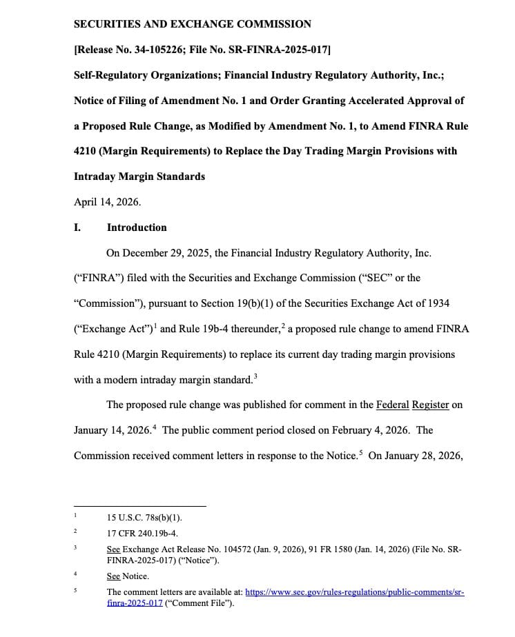 On April 14, 2026, U.S. regulators approved a structural shift in market access by eliminating the Pattern Day Trader rule and replacing it with intraday margin standards. The long-standing 25,000 dollar equity requirement is removed, transitioning the system from a fixed threshold to a risk-based framework.