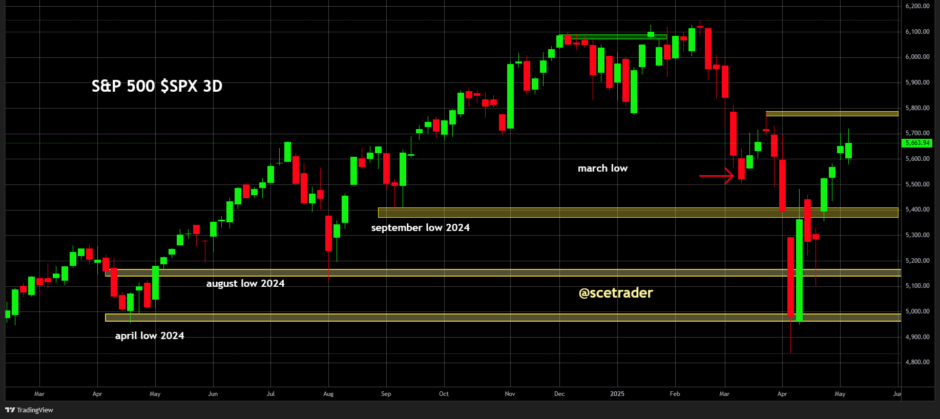 Voor de S&P 500 index gebruiken we de chart met gele balken, die de belangrijkste steunniveaus aanduiden. Deze niveaus zijn gebaseerd op de dieptepunten van eerdere maanden. Opvallend is dat het dieptepunt van april 2024 duidelijk een belangrijk keerpunt is geweest.