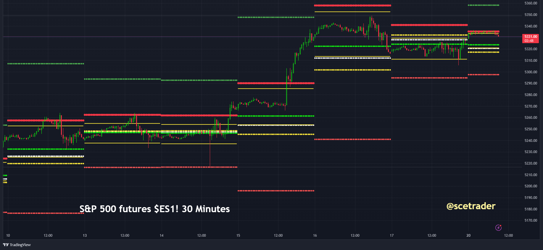 Op basis van de huidige pivot points is het nog onzeker of de Amerikaanse beurs vanmiddag hoger zal starten. Opvallend is dat de rode lijn nu als weerstand dient. Tegelijkertijd liggen er verschillende pivot points op een iets lager niveau, met een gemiddelde van ongeveer 5320 op de S&P 500 future $SPX.
