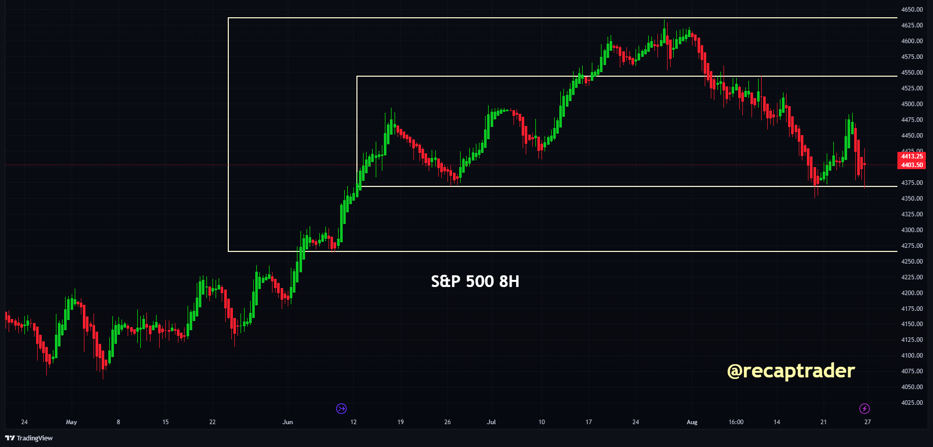 De belangrijkste index van de wereld, de S&P 500 $SPX, laat op een chart van 8 uur zien dat we mogelijk tevreden mogen zijn als deze in een bepaalde bandbreedte blijft. De eerste twee toppen worden gezien rond de 4640 en 4540. De eerste bodems worden gezien rond de 4270 en de 4370.