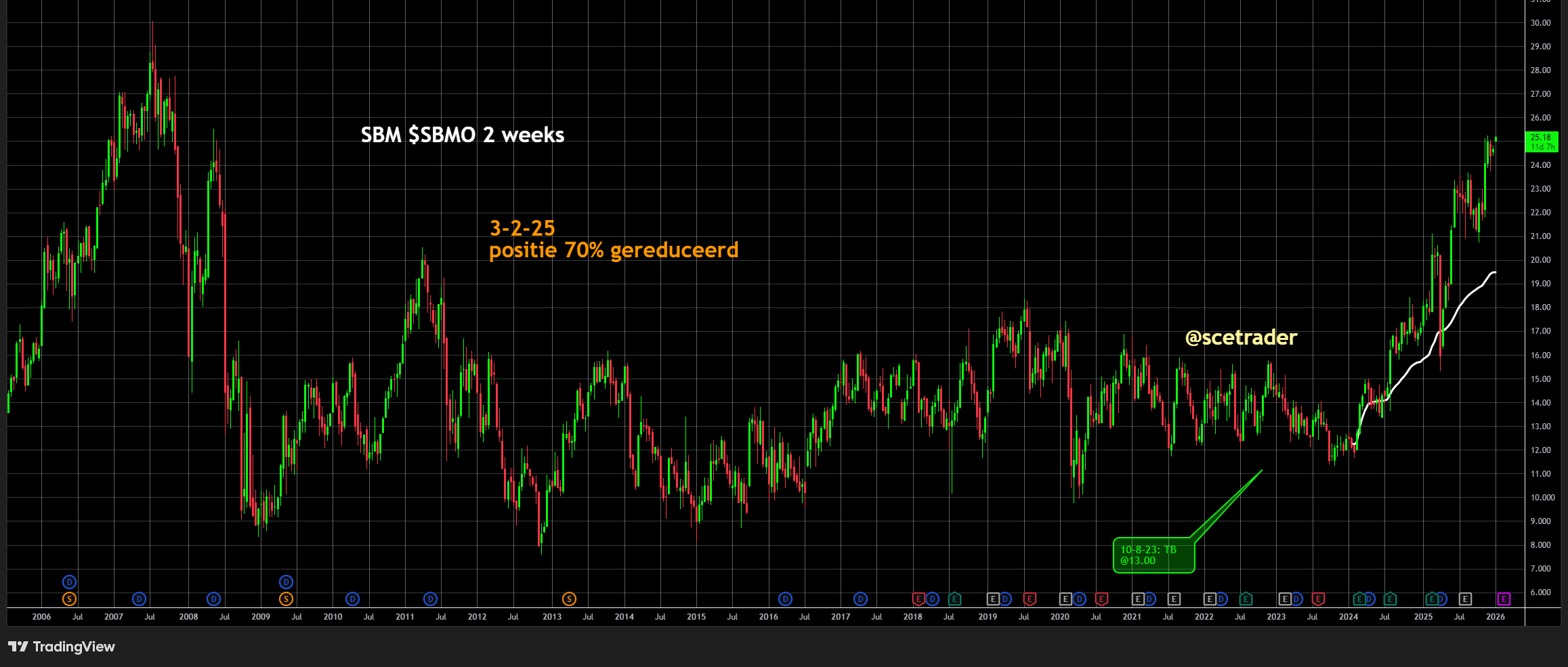 Wij doen op dit moment niets extra met het aandeel SBM Offshore. Wij hebben de positie in 2023 opgebouwd rond 13 euro, in een periode waarin het sentiment rond offshore olie extreem negatief was en vrijwel niemand het aandeel wilde hebben. Die timing bleek juist. Op basis van de huidige situatie zien wij echter geen reden om het aandeel bij te kopen.