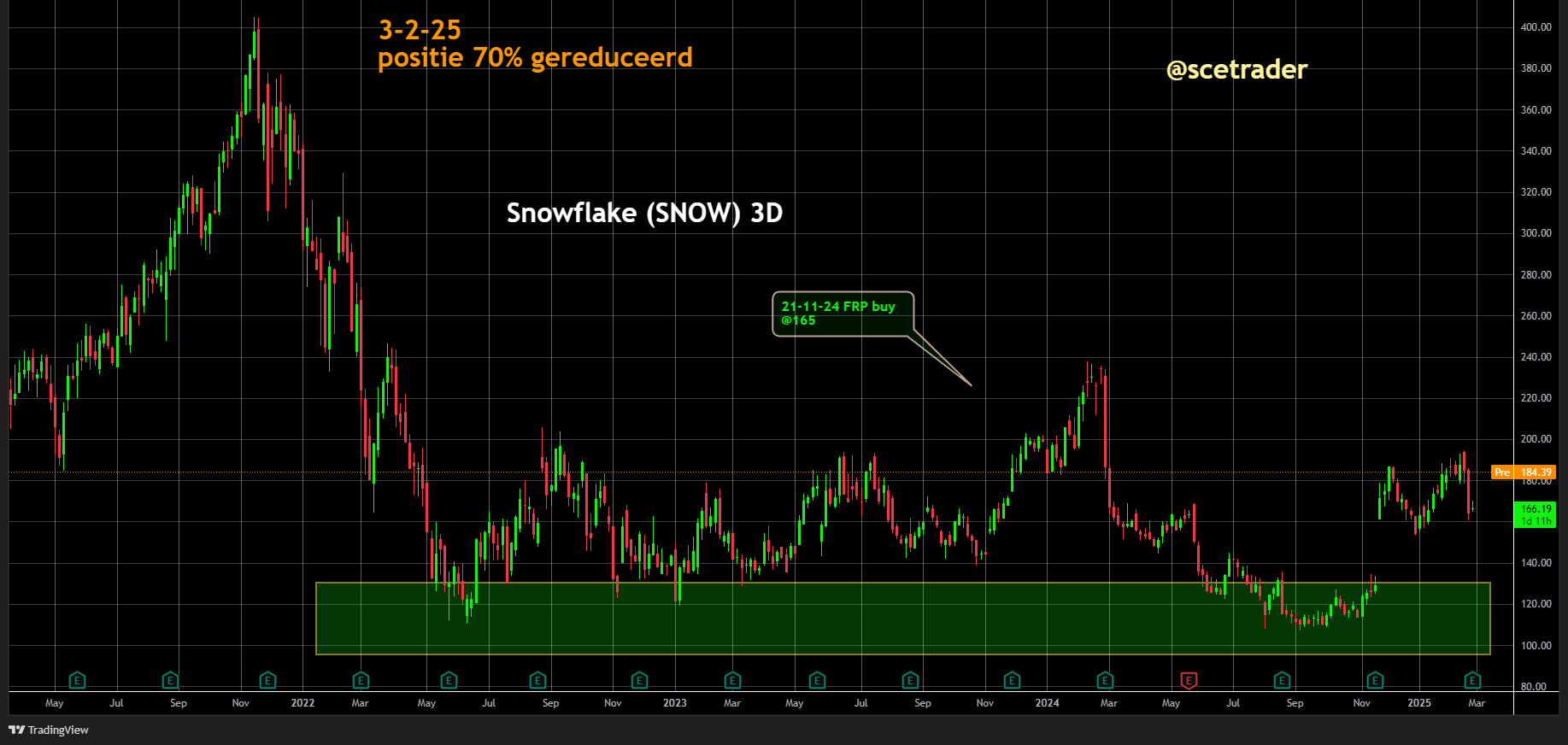 We zitten op een stijging van het aandeel Snowflake, maar beschouwen de koersstijging van 11% als broos, gezien de algehele stemming in de technologiesector. Wel blijven we op een up zitten.