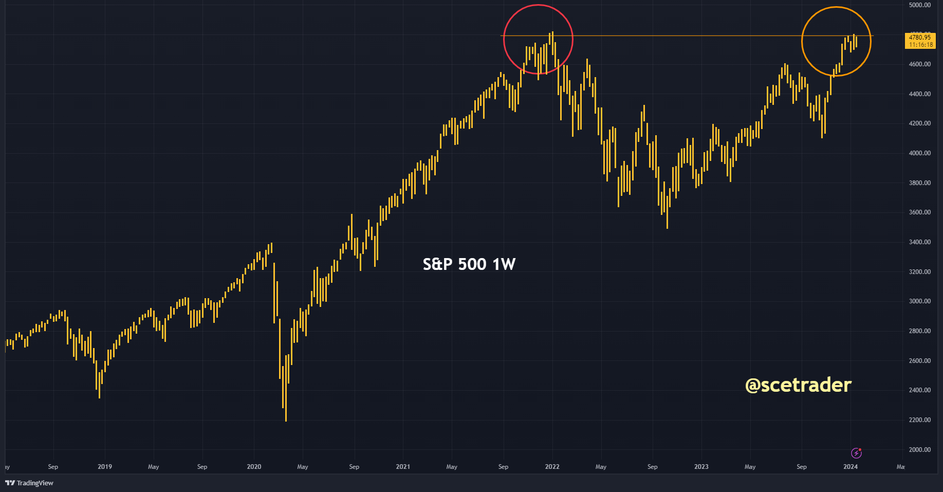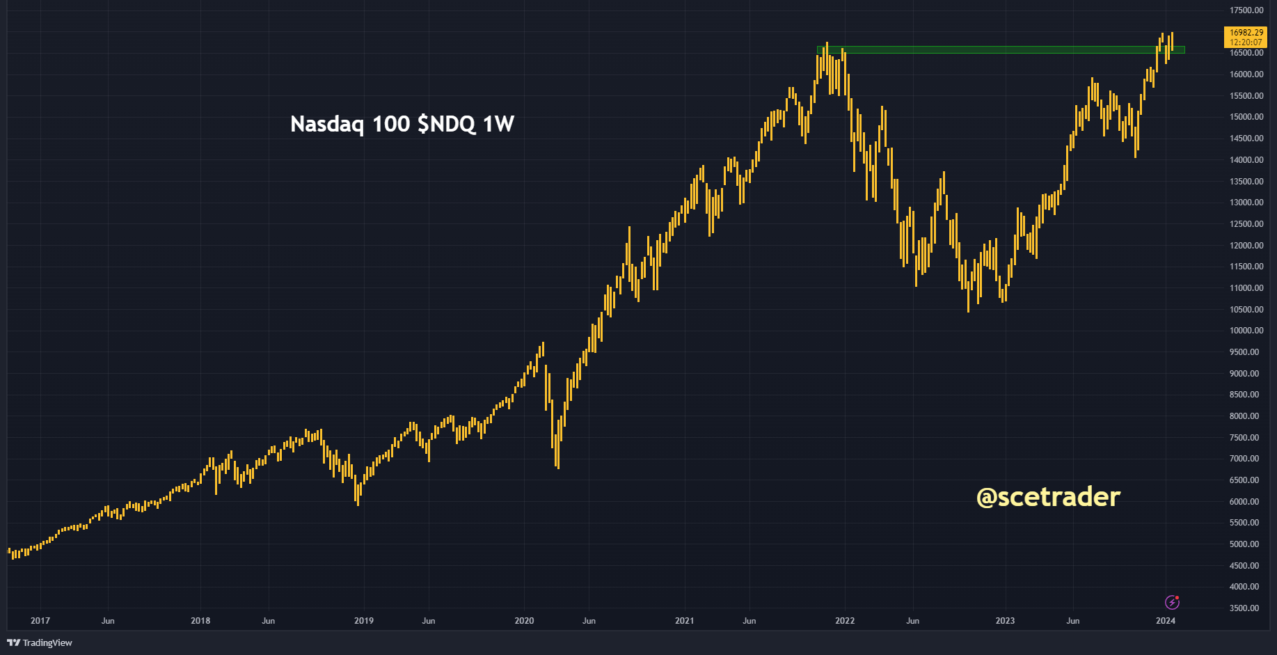 Terwijl de Nasdaq 100 $NDX weer een all-time high heeft bereikt en de S&P 500 $SPX gisteren hoger was, bevindt deze zich nog steeds in een strijd met dezelfde grens als eind 2021.