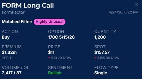 The options market shows a clear and notable positioning in FormFactor, where a large party is betting on a strong upward move within a relatively short period of time. This involves a sizable long call purchase with a clear directional bias, which typically signals conviction rather than hedging.