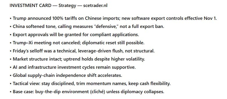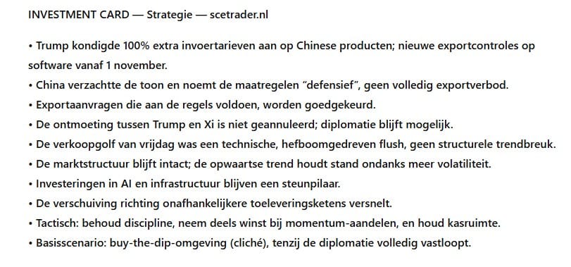 Positief –> Diplomatie herleeft: China’s mildere toon zorgt voor lucht. De exportcontroles zijn geen blokkade maar een drukmiddel, en als Trump dit weekend reageert met uitstel of verzachting van de tarieven, kan de markt direct herstellen.