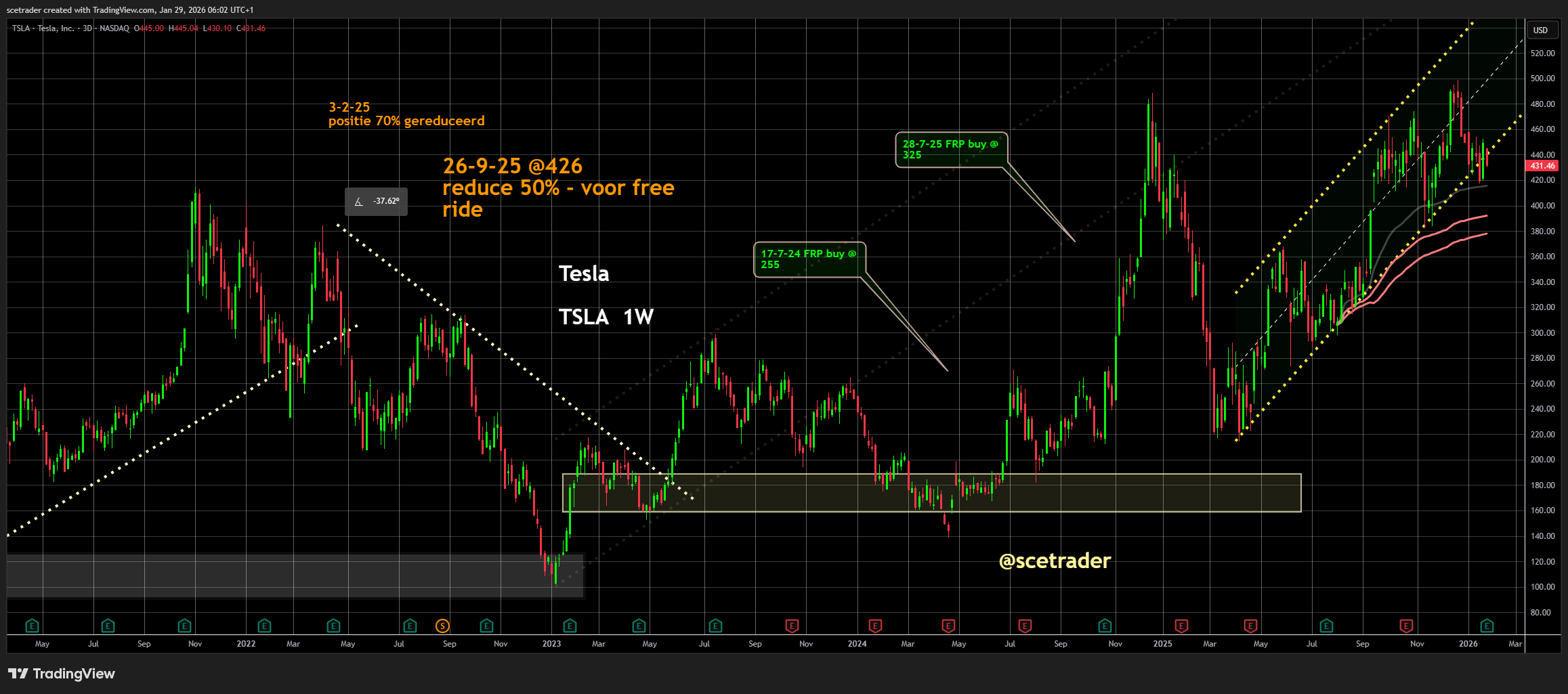 Wij zitten op een stijging van het aandeel. Tesla bevindt zich midden in een strategische herpositionering waarbij de onderneming evolueert richting een technologieplatform met meerdere groeipijlers. De kern van de beleggingscase verschuift structureel van voertuigvolumes naar schaalbare technologie, software en AI-gedreven toepassingen.
