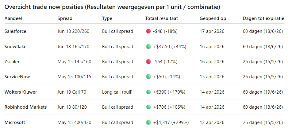 De winst wordt gedragen door Microsoft en Robinhood Markets, met daarnaast een sterke bijdrage van Wolters Kluwer. Dit zijn posities waar momentum direct aanwezig was en de hefboom van opties volledig tot uiting komt.