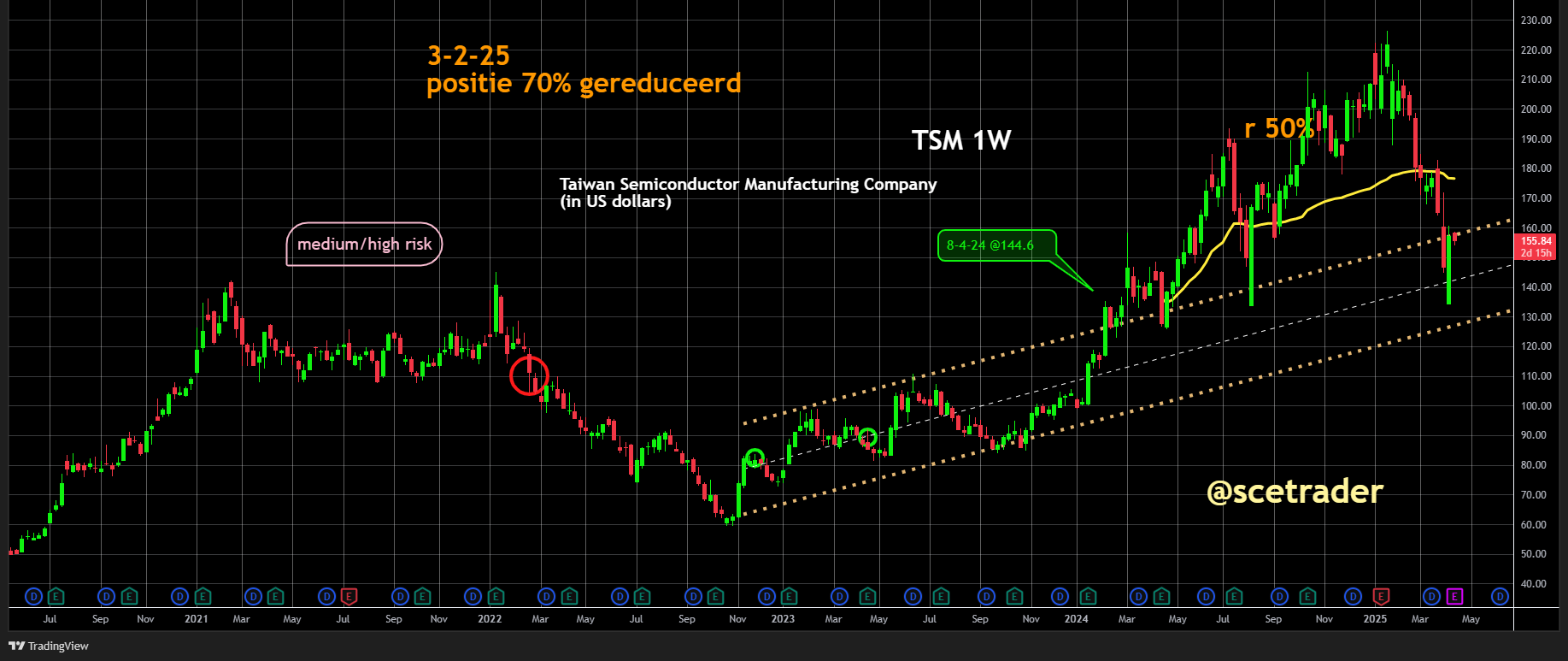 We zitten gereduceerd met 70% op een stijging van het aandeel TSMC. Door de positieve vooruitzichten en de groeiende vraag naar geavanceerde halfgeleideroplossingen is de kan steeds groter dat het tijd wordt om weer groter in de stappen.