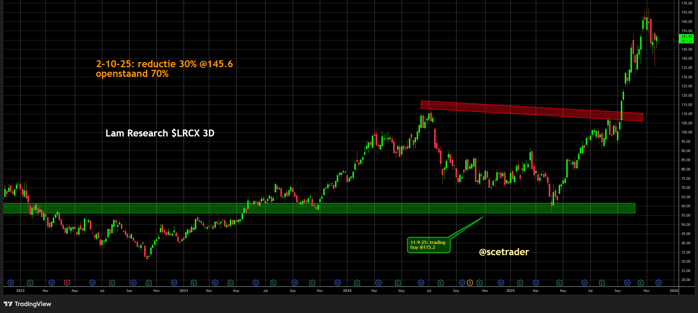 Ook bij Lam Research blijven wij op een stijging zitten. De wafer-fabrication equipment-cyclus wordt duidelijk gesterkt door TSMC’s versnelde wereldwijde uitrol. Etch- en cleaning-technologieën blijven essentieel in de overgang naar 2-nanometer en A16, waardoor Lam Research stevig profiteert van deze trend.