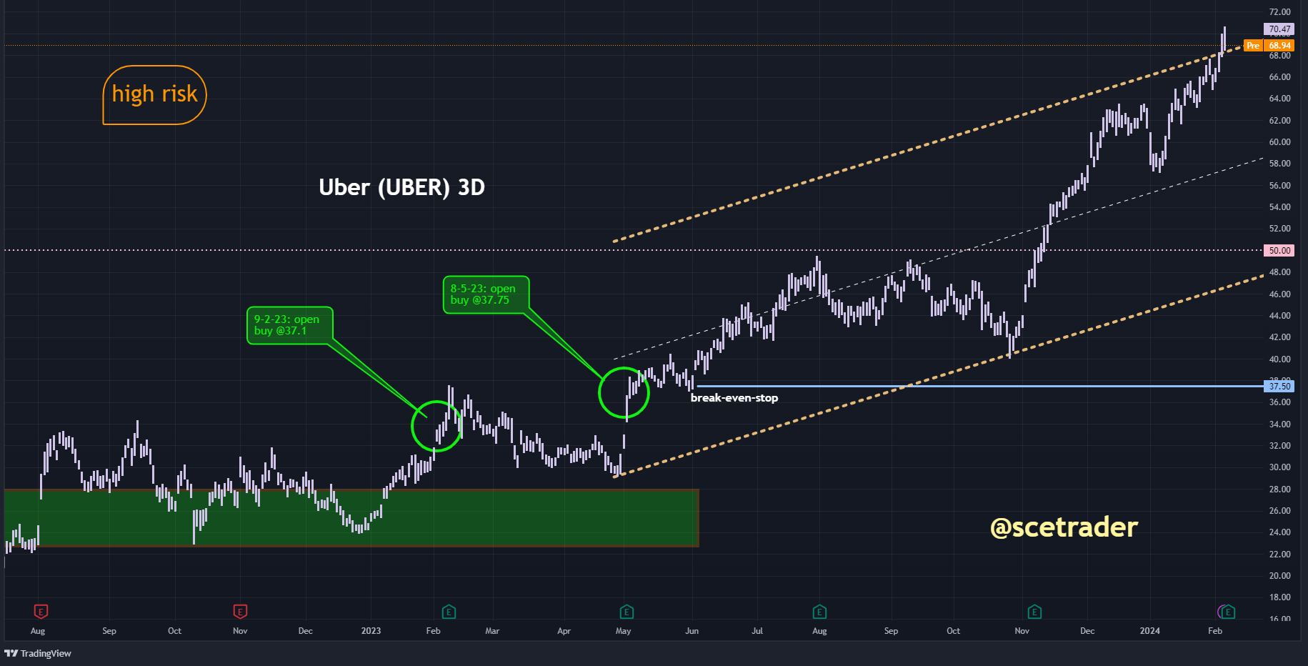 Als we eerst kijken we naar de koers op basis van prijs actie dan zien we op de charts dat het aandeel op prijs gedreven actie duidelijk opwaarts beweegt. Wij zijn overigens voor het eerst in Uber gaan stappen toen de koers op 37,1 dollar stond, dat was in februari 2023.