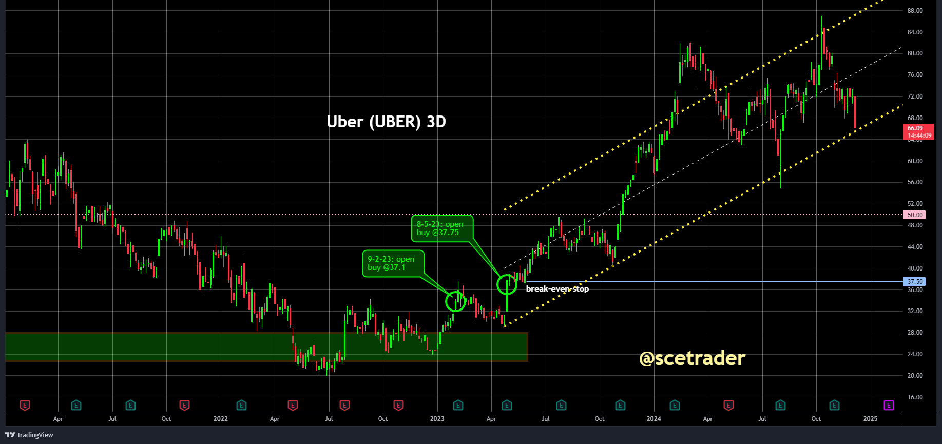 Het aandeel Uber is onlangs fors gecorrigeerd. We zitten trouwens op een up (zie ook de database). Misschien dat er om bepaalde redenen zoals de angst voor concurrentie van zelfrijdende auto's nog wel een verdere daling zullen zien.
