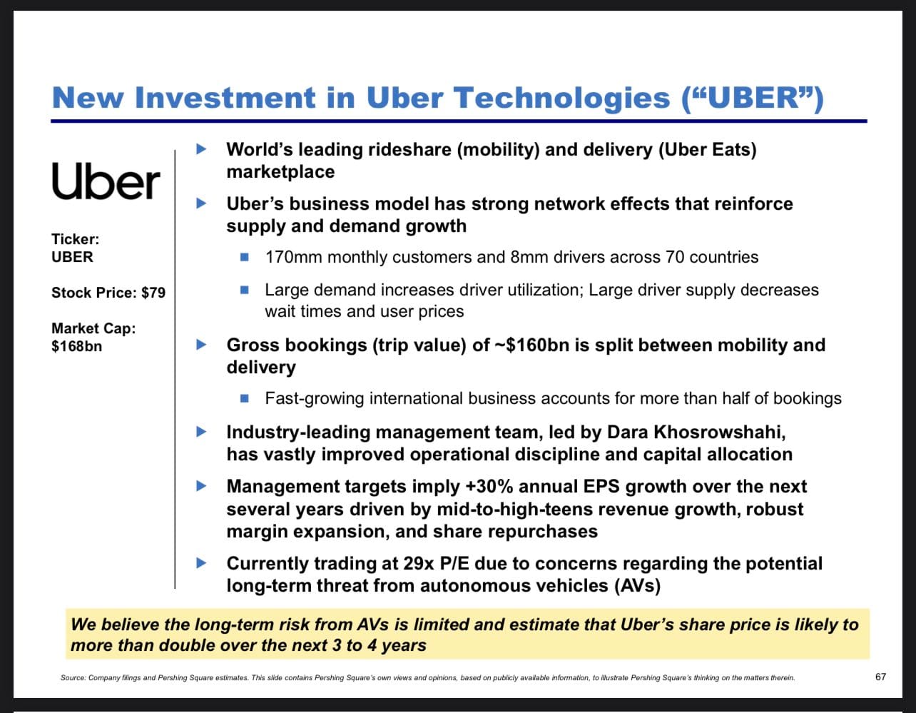 Bill Ackman heeft zojuist zijn presentatie voor beleggers vrijgegeven. Hier zijn de dia's voor de Uber investering. Dit willen we brengen aangezien we zelf ook denken dat het aandeel Uber $UBER ondergewaardeerd is. Zie ook de database.