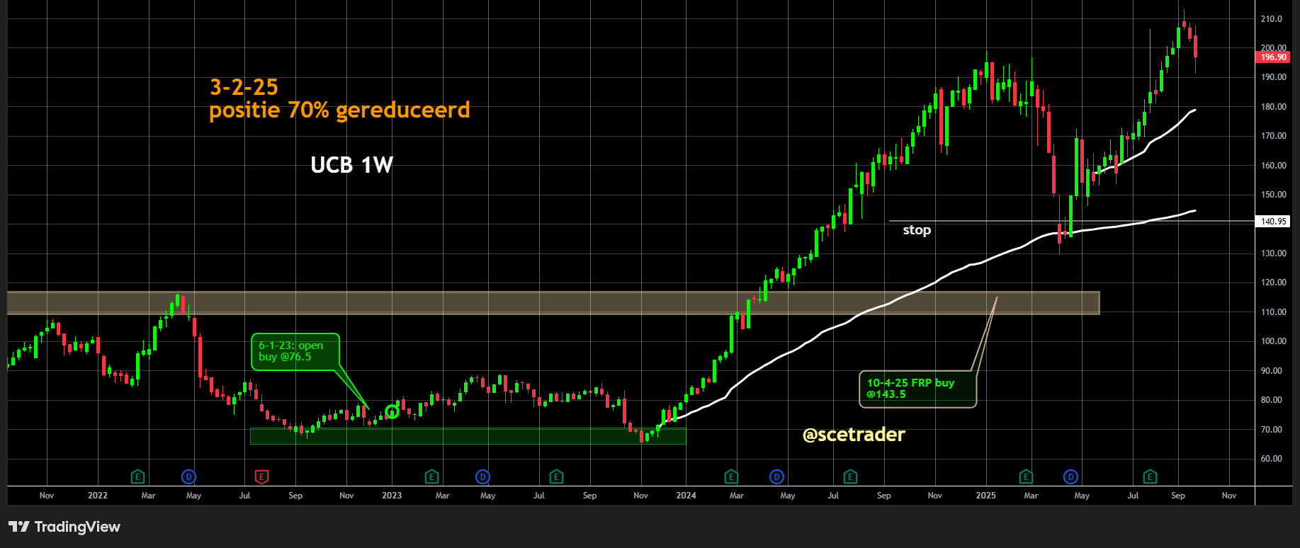 We hebben een grote winst opgebouwd op UCB dankzij de instap op 76,5 euro begin 2023. Op 3 februari 2025 hebben we 70% van de positie gereduceerd en op 10 april volgde een extra aankoop tegen 143,5 euro.