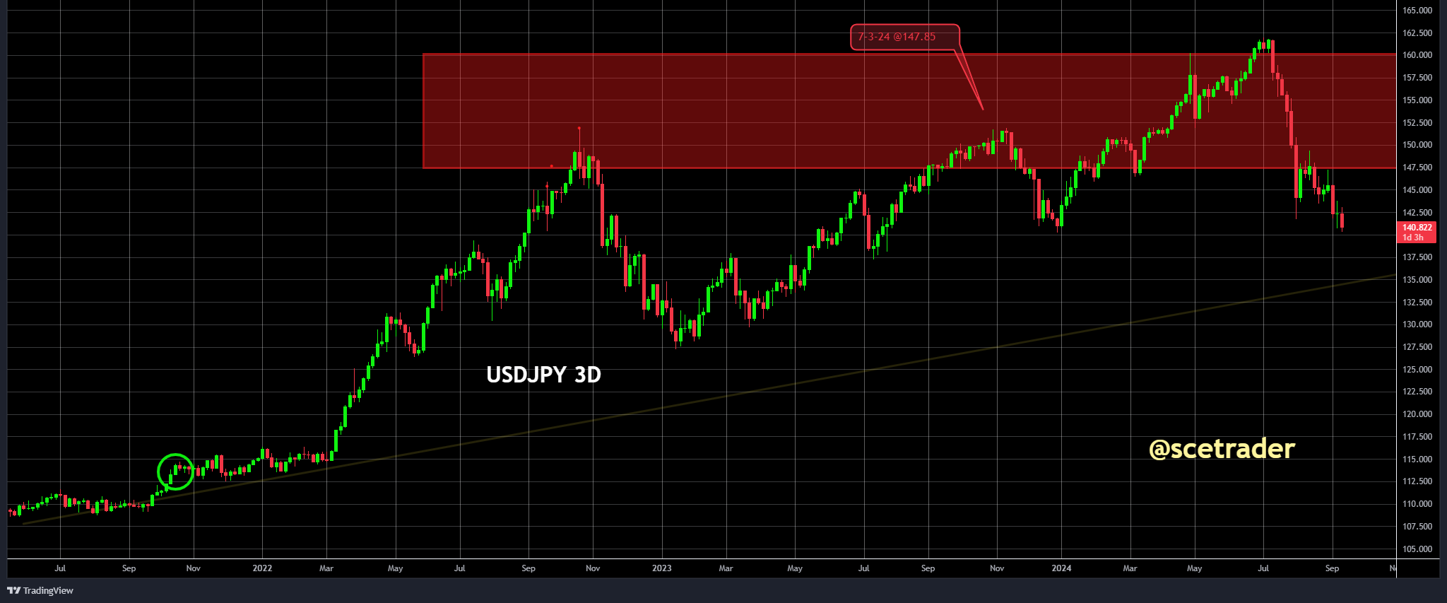 Daarmee is de carry trade-afbouw duidelijk zichtbaar. Nog steeds lijkt de afbouw door te gaan, ook al doet de BoJ "even niets" met de rentevoet. Dit komt vooral doordat de markt niet uitsluit dat de Fed op woensdag de rente zelfs met 50 basispunten gaat verlagen.