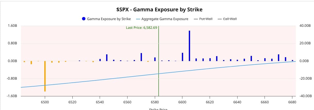 Once either of these levels is convincingly broken, the dynamic shifts immediately, and this could already become visible early next week. Above 6600, the dampening effect of positive gamma disappears and market makers are forced to hedge with the move, creating additional buying pressure and accelerating the upside.