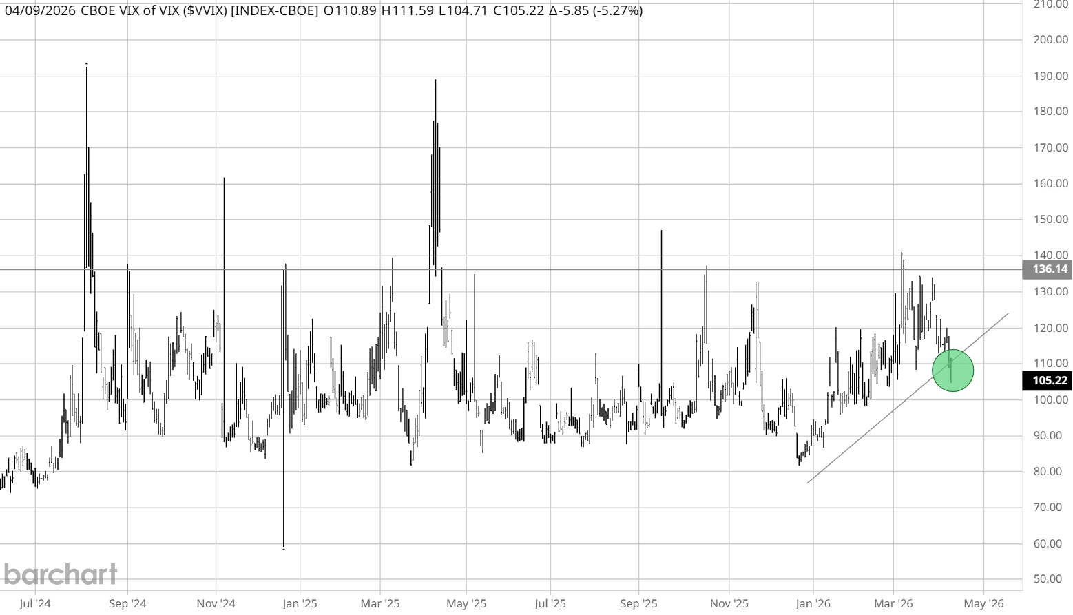 De VVIX, de volatiliteit van de VIX, is teruggevallen. Dat betekent dat de angst voor plotselinge bewegingen afneemt en dat het vertrouwen in de korte termijn trend voorzichtig terugkomt.