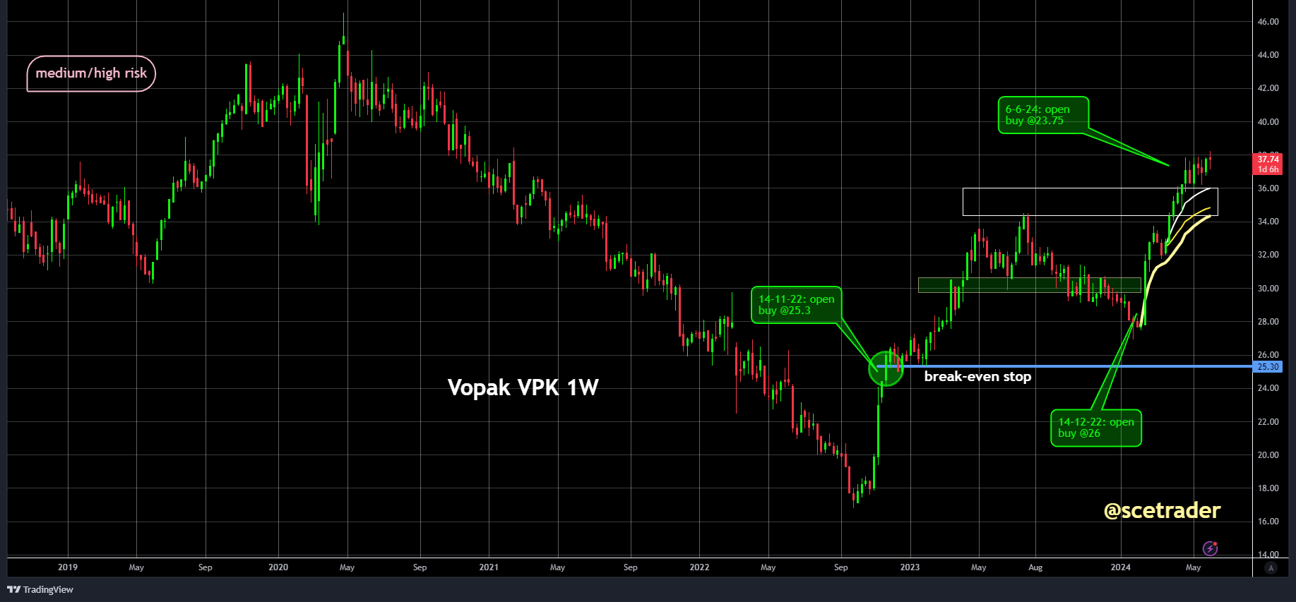 Dan nu de chart en daarna kijken we verder. Vopak bevindt zich sinds eind 2022 in een opwaartse trend. De opwaartse trend begon na een lange neerwaartse beweging. Daarna zien we hogere toppen en hogere bodems wat een kenmerk is van een gezonde opwaartse trend. Het tussentijdse weerstandsniveau ligt rond de €38.