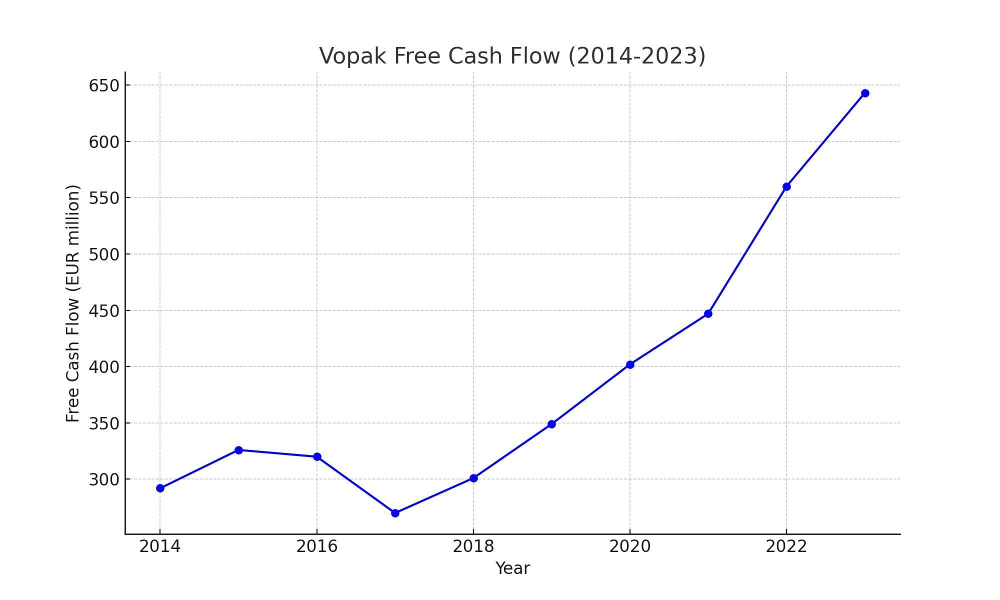 De vrije kasstroom van Vopak laat een duidelijke opwaartse trend zien van EUR 292 miljoen in 2014 tot EUR 643 miljoen in 2023. Dit benadrukt de sterke financiële gezondheid en het effectieve kostenbeheer van het bedrijf over de afgelopen jaren.