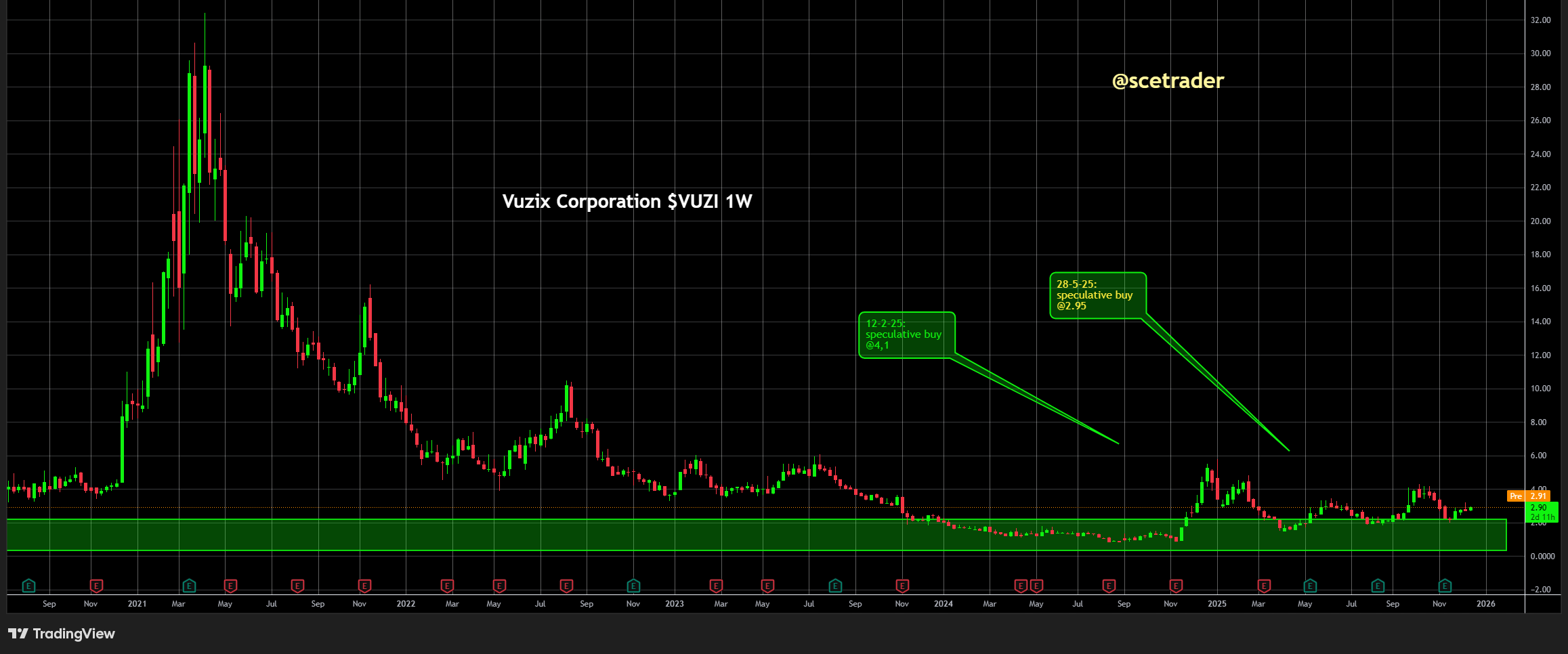 Wij zitten op een stijging. Zie ook de database. Dit is een hoog risico-aandeel en de positie is daarom bewust niet groot, maar de overtuiging achter de positie is duidelijk. Vuzix is een aandeel dat bij succesvolle uitvoering uitzonderlijk hard kan stijgen, terwijl het risico inherent is aan de fase waarin het bedrijf zich bevindt.