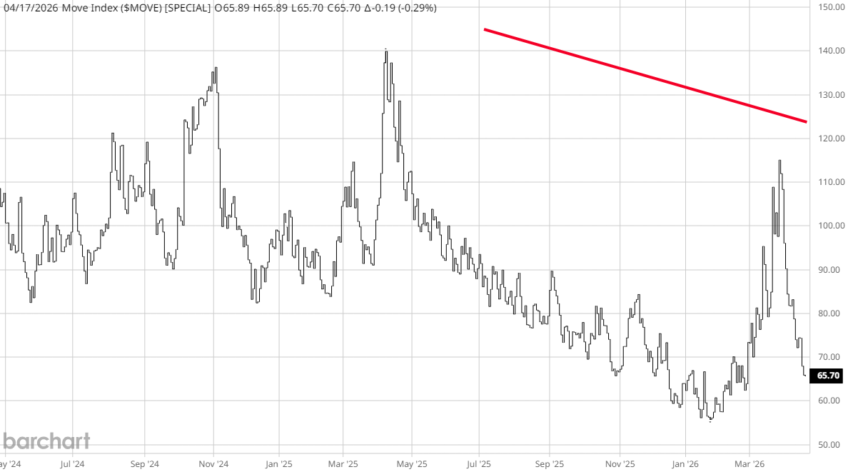 De MOVE-index meet volatiliteit in de obligatiemarkt en speelt een sleutelrol in waarderingen. De huidige stabilisatie betekent dat rentes minder schokgevoelig zijn, wat positief is voor groeiaandelen.