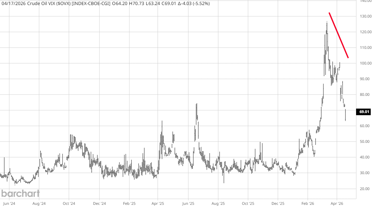 OVX meet de volatiliteit in olieprijzen en is een belangrijke macro-indicator. De recente daling betekent dat een deel van de geopolitieke risicopremie uit de markt wordt gehaald.