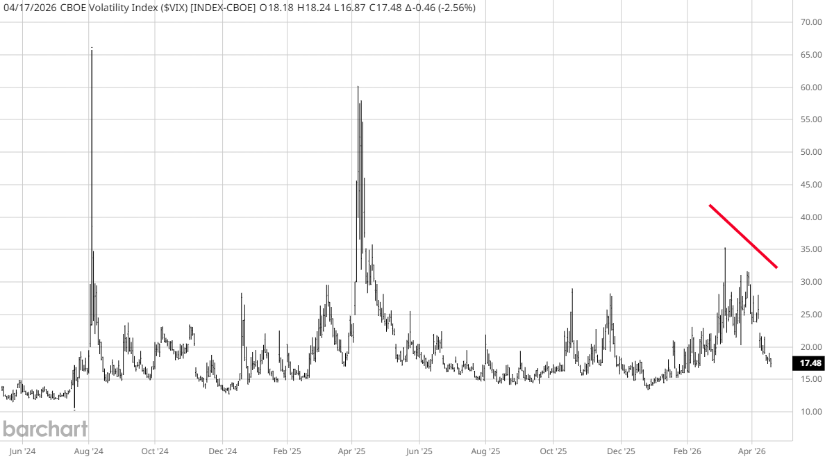 The VIX measures expected volatility in the S&P 500 and serves as the primary gauge of equity risk. The current decline suggests that investors are buying less protection and have more confidence in near-term stability.
