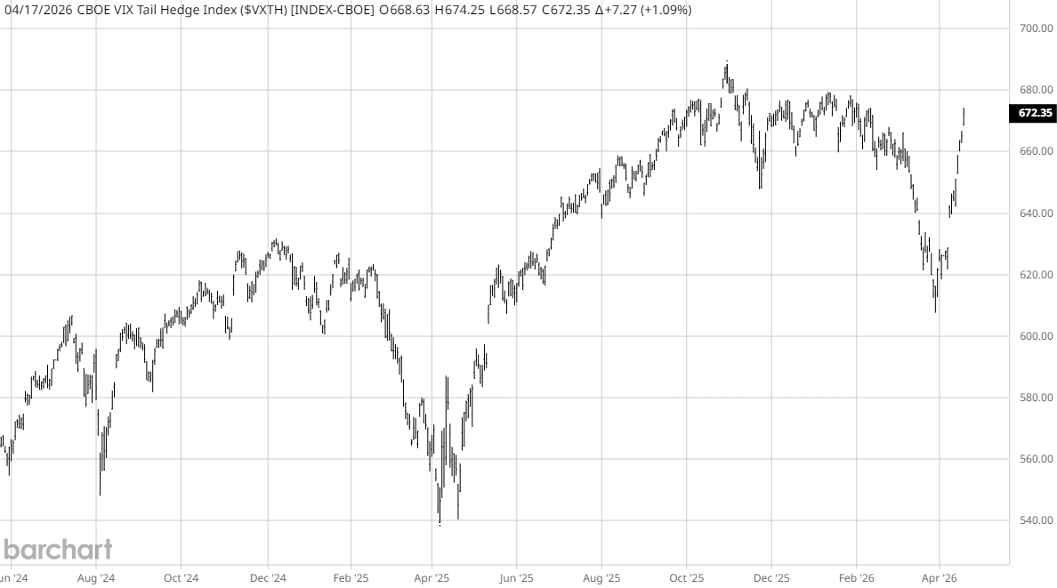 VXTH measures the performance of tail hedge strategies and provides insight into demand for protection against extreme market declines. The recent increase diverges from the decline in other volatility indices.
