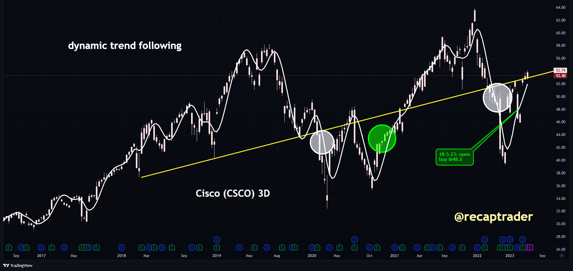 We zijn eerder dit jaar in mei ingestapt op een stijging op $48,2. De reden hiervoor is dat Cisco, dat aan de basis stond van het internettijdperk, nu weer een essentiële rol kan gaan spelen als backbone voor AI.