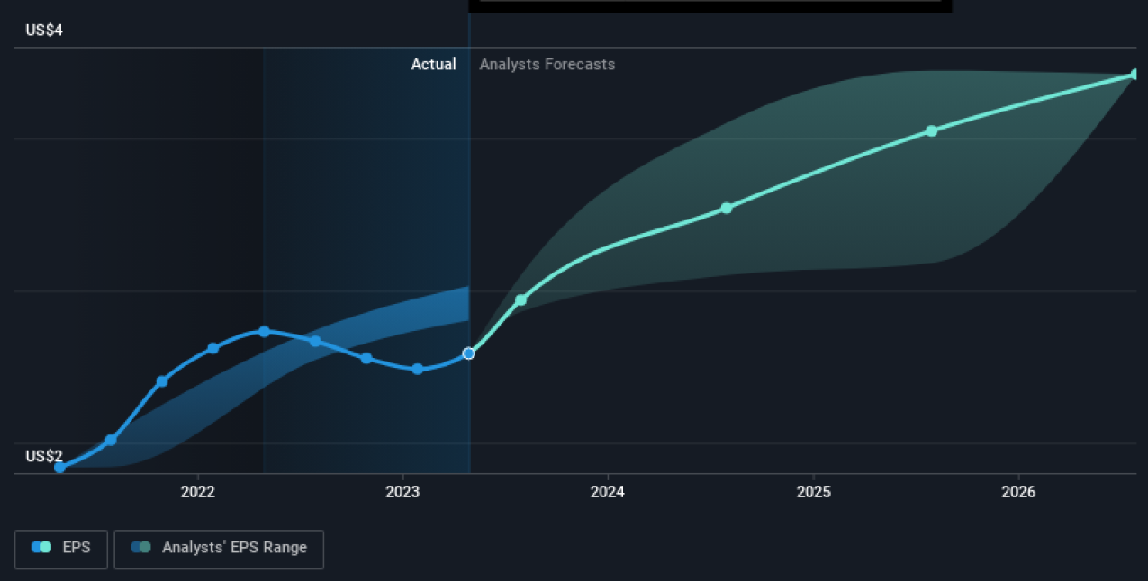 De markt heeft dit volgens ons nog niet volledig ingezien. De impact op AI zal vermoedelijk vanaf 2024 merkbaar zijn. Momenteel voorspellen Wall Street analisten een winst per aandeel (wpa) van $3.27 voor 2023, een wpa van $3.52 voor 2024 en een wpa van $3.71 voor 2025.