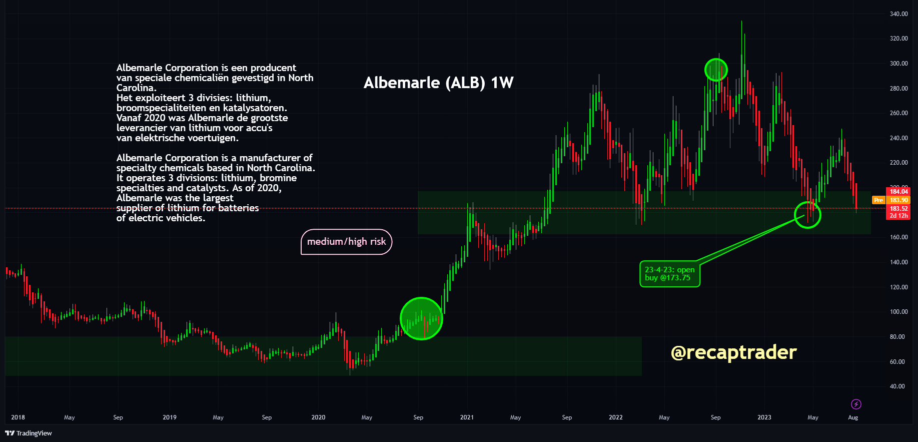 Eén van de aandelen waar wij op een up zitten is Albemarle $ALB. Ook dit aandeel ontkomt niet aan de malaise. Maar we blijven toch zitten en denken dat over een langere periode de koers het beter zal doen dan de markt. We zijn in 3 stappen op een stijging gaan zitten in het aandeel Albemarle.