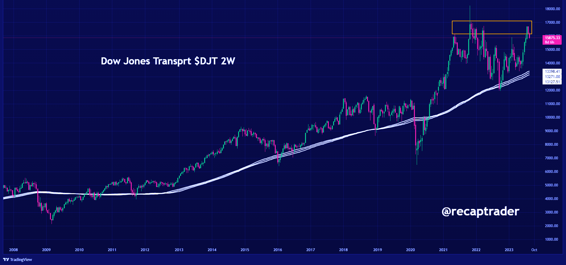 De Dow Jones Transport index $DJT corrigeert ook vanaf de vorige toppen. Deze index wordt nog steeds door velen gezien als een indicator voor de economische activiteit.