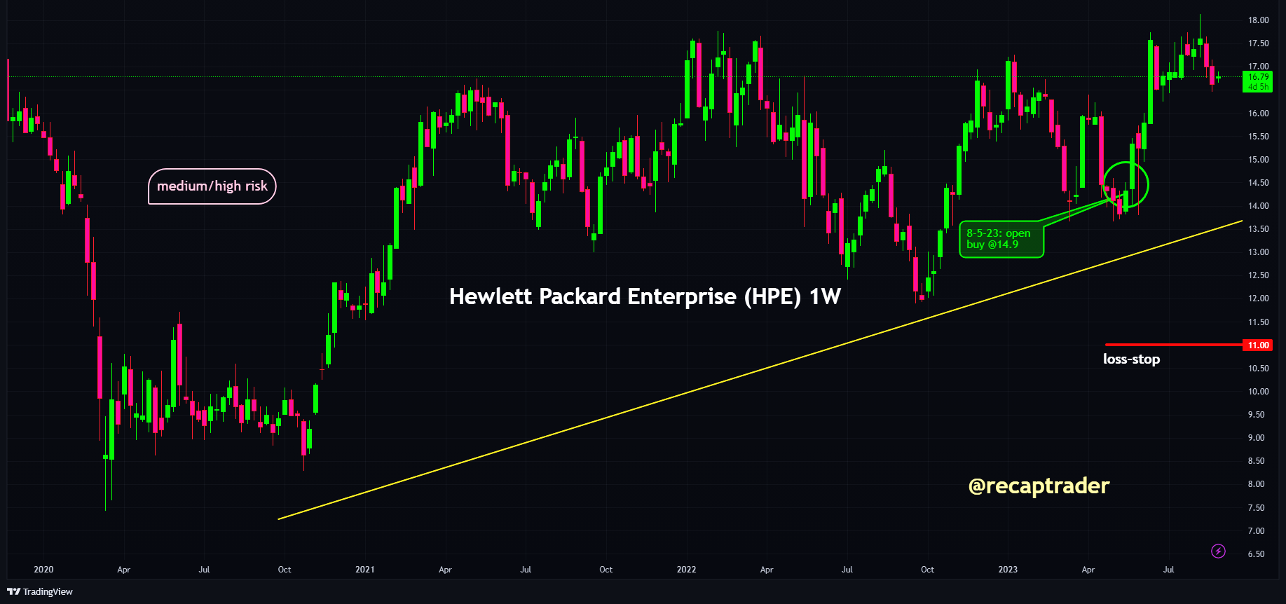 Morgen, na de sluiting van de markt, zal Hewlett Packard Enterprise $HPE haar resultaten onthullen. Analisten schatten een omzet van $6,99 miljard, een bescheiden stijging van 0,5% op jaarbasis, bij een winst van $0,47 per aandeel, wat een daling van 2,1% zou betekenen. [Het aandeel beoordelen we positief hebben en overwegen om bij een dip te verzwaren vanwege de toekomstige kansen in AI. ]