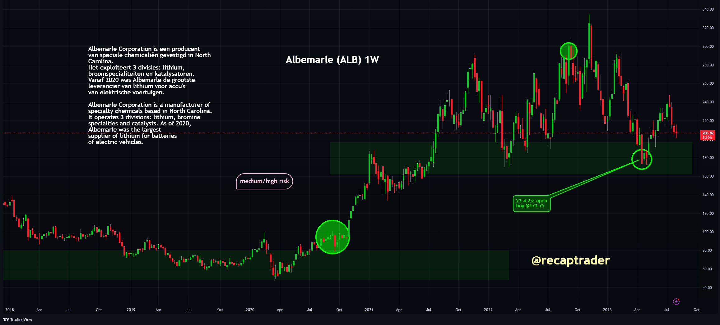 Op woensdag heeft Albemarle $ALB - de grootste producent van lithium in de wereld - zijn winstvoorspelling voor 2023 verhoogd na beter dan verwachte kwartaalresultaten. Het aandeel staat vandaag 3% hoger. Het bedrijf houdt vandaag een conference call en daar verwachten we een positieve toon.