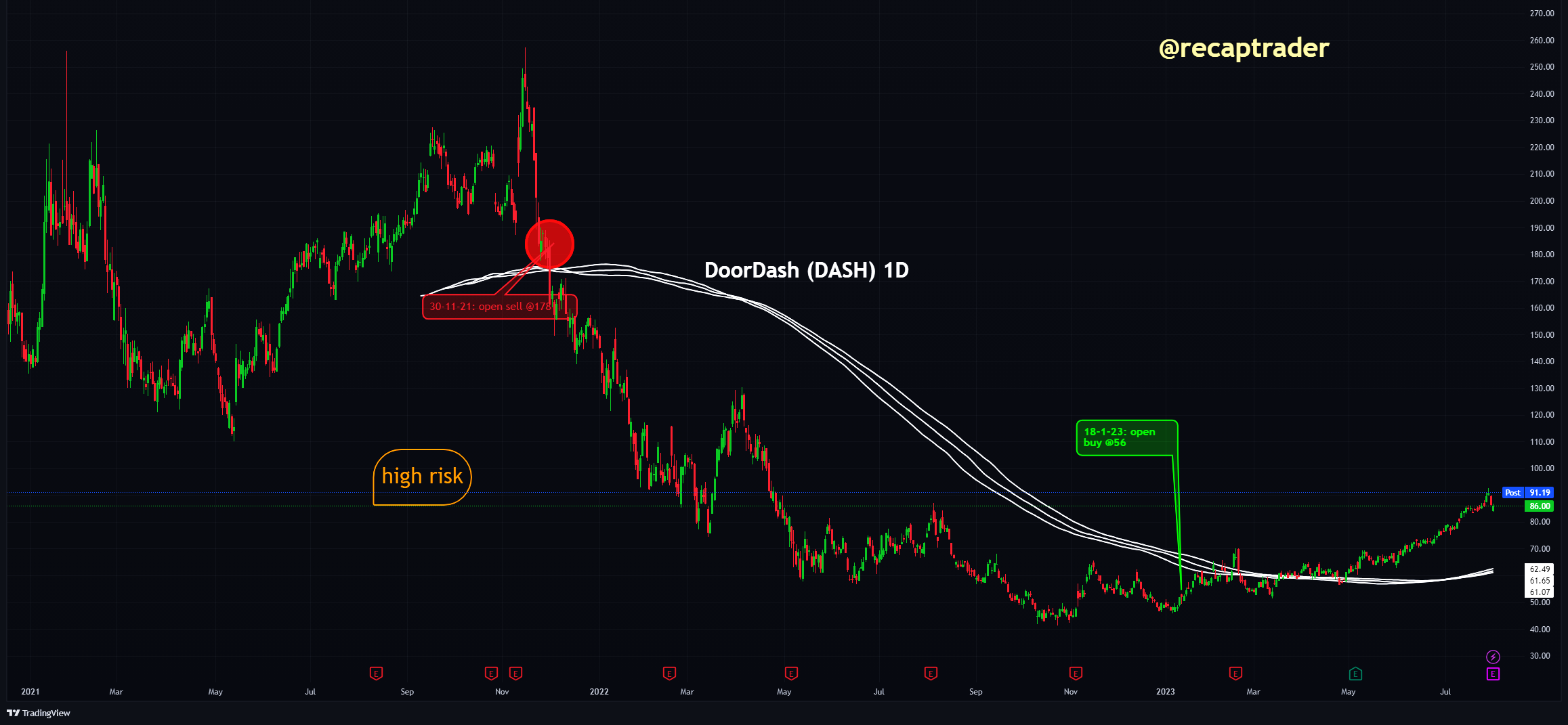 De cijfers van DoorDash $DASH zijn aardig, maar vooral de opnieuw verhoogde guidance is een grote verrassing. We zitten long vanaf de $56 en houden deze positie aan, waarbij we nu niet meer zouden bijkopen. De koers kan zeker verder stijgen (afhankelijk van het sentiment), maar we moeten er ook rekening mee houden dat de kans kleiner wordt dat het bedrijf nogmaals de verwachtingen gaat verhogen bij de volgende presentatie van de cijfers.