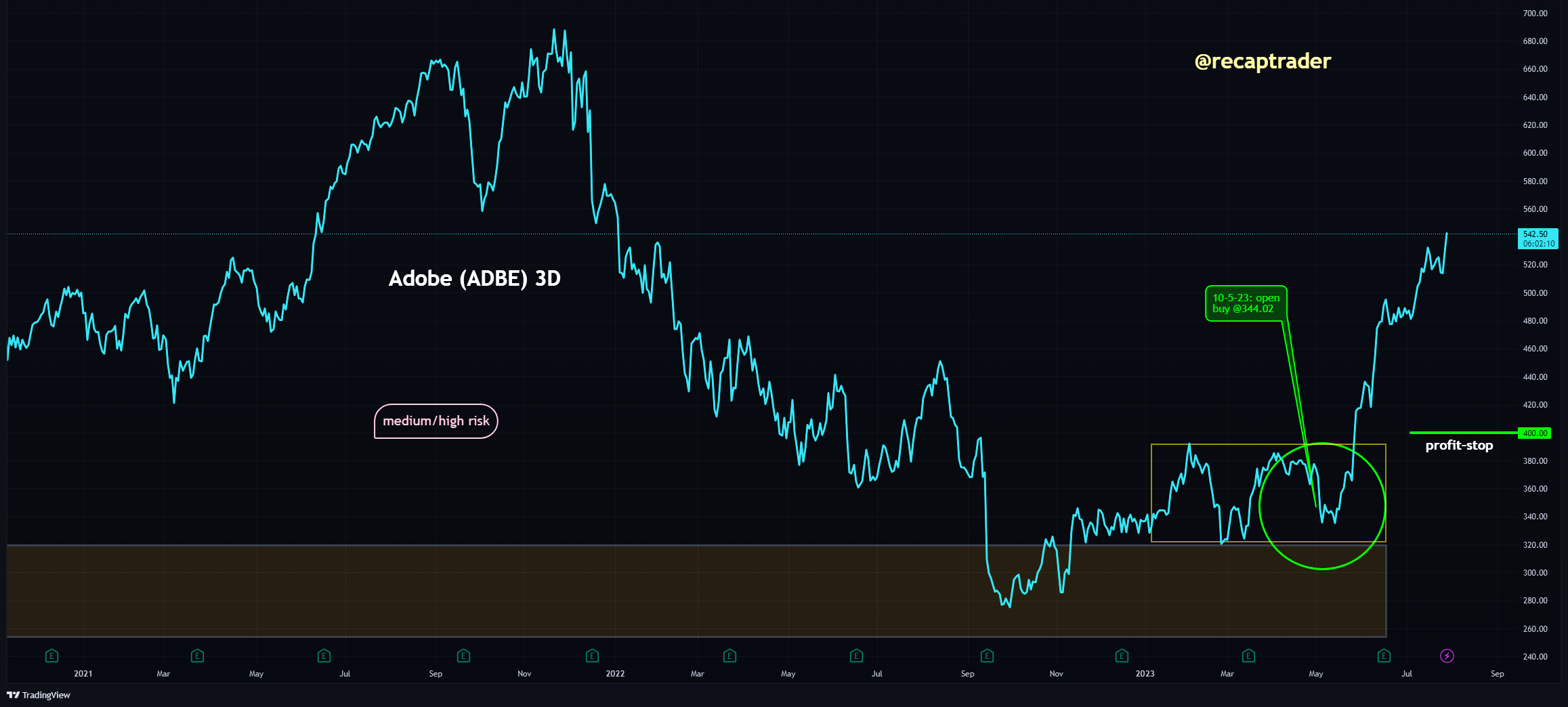 Nu is het sentiment rond Adobe volledig veranderd. We zitten op een up vanaf mei, maar kopen momenteel niet bij. Waarschijnlijk zullen we onze stop loss verhogen om een "free ride" te hebben. Het aandeel loopt nu al vooruit op de kansen van AI.